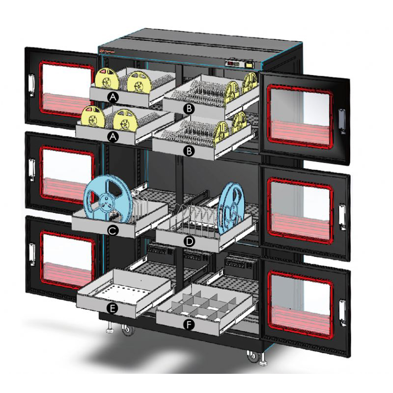 The dry cabinet features built-in network connectivity, allowing users to integrate additional remote monitoring software. This enables centralized, remote monitoring of the cabinet’s status for each device. Additionally, the cabinet includes internal lighting, enhancing visibility and convenience when accessing stored items.